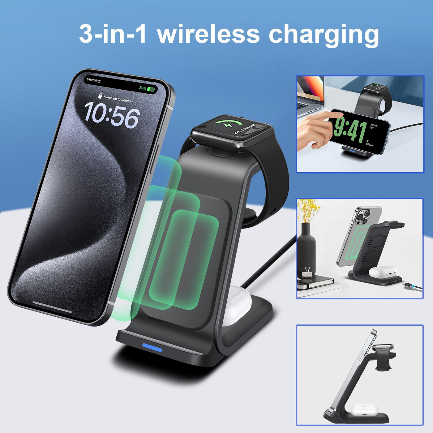 Kompatibel mit allen Smartphones mit kabelloser Ladefunktion, von Uhren bis hin zu Ohrhörern und mehr. Der kabellose Ladeständer ermöglicht das gleichzeitige Laden von drei Geräten. Schluss mit lästigem Kabelsalat! Sparen Sie sich die Zeit zum Entwirren und sparen Sie Platz auf dem Schreibtisch für ein ordentliches Erscheinungsbild.